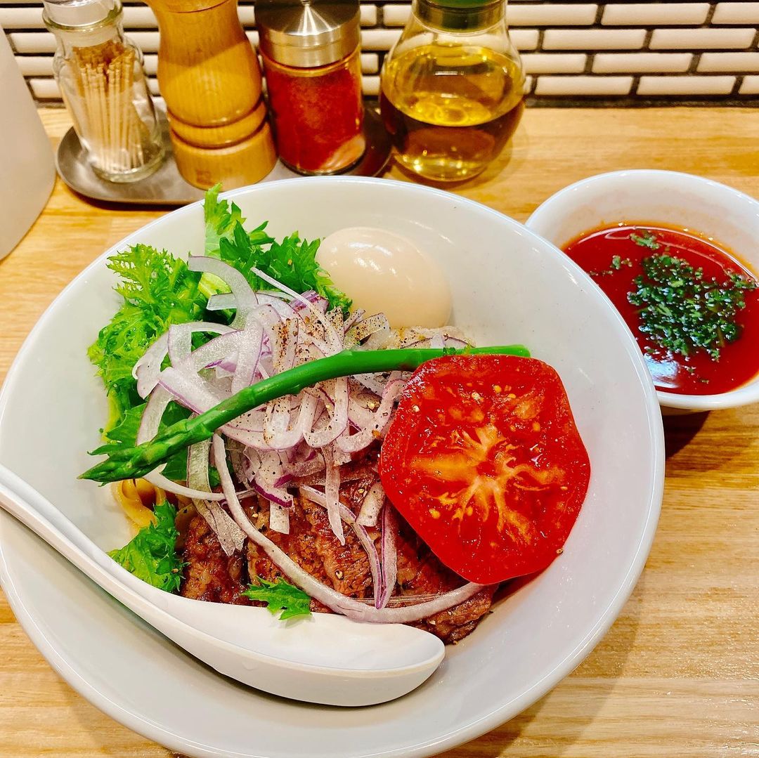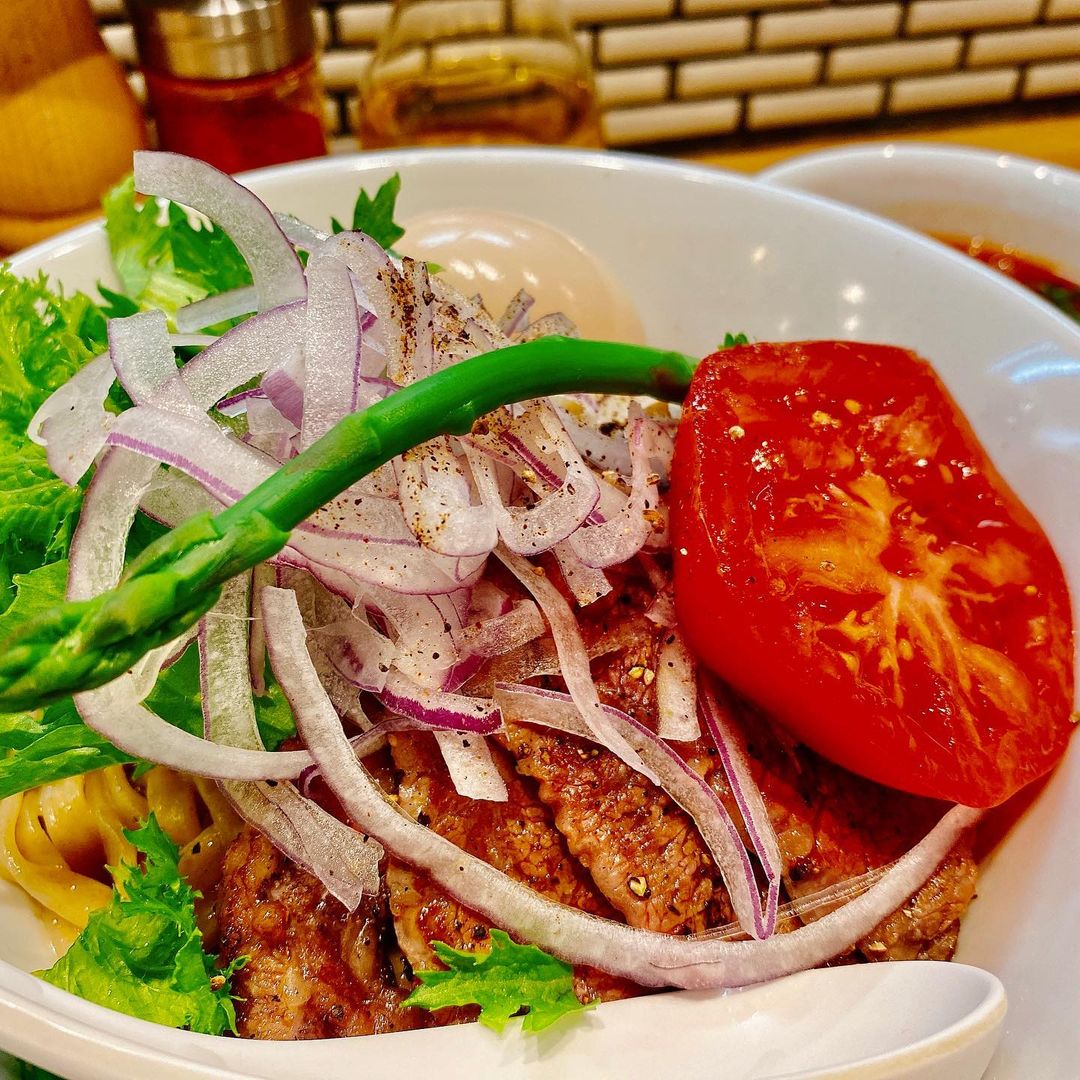 すみません、もう終わってしまいました。チャーシューの代わりに和牛カルビ、ビジュアルからしてどう見ても自分の好みだと思い、明日食べに行こうと決めた一杯。牛すじや野菜を絡めながら、トマトを崩して食べていきます。
