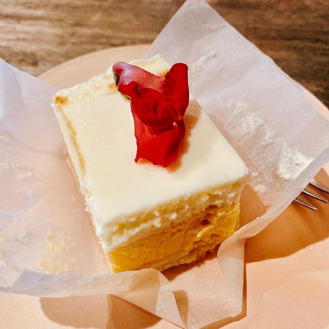 花びらののった可愛らしい見た目。クリームは濃すぎない程度に甘く爽やか。コーヒーにとてもよく合いました。メニューはケーキセットのみ、アーモンドケーキかレアチーズ、コーヒーかほうじ茶があるだけです。