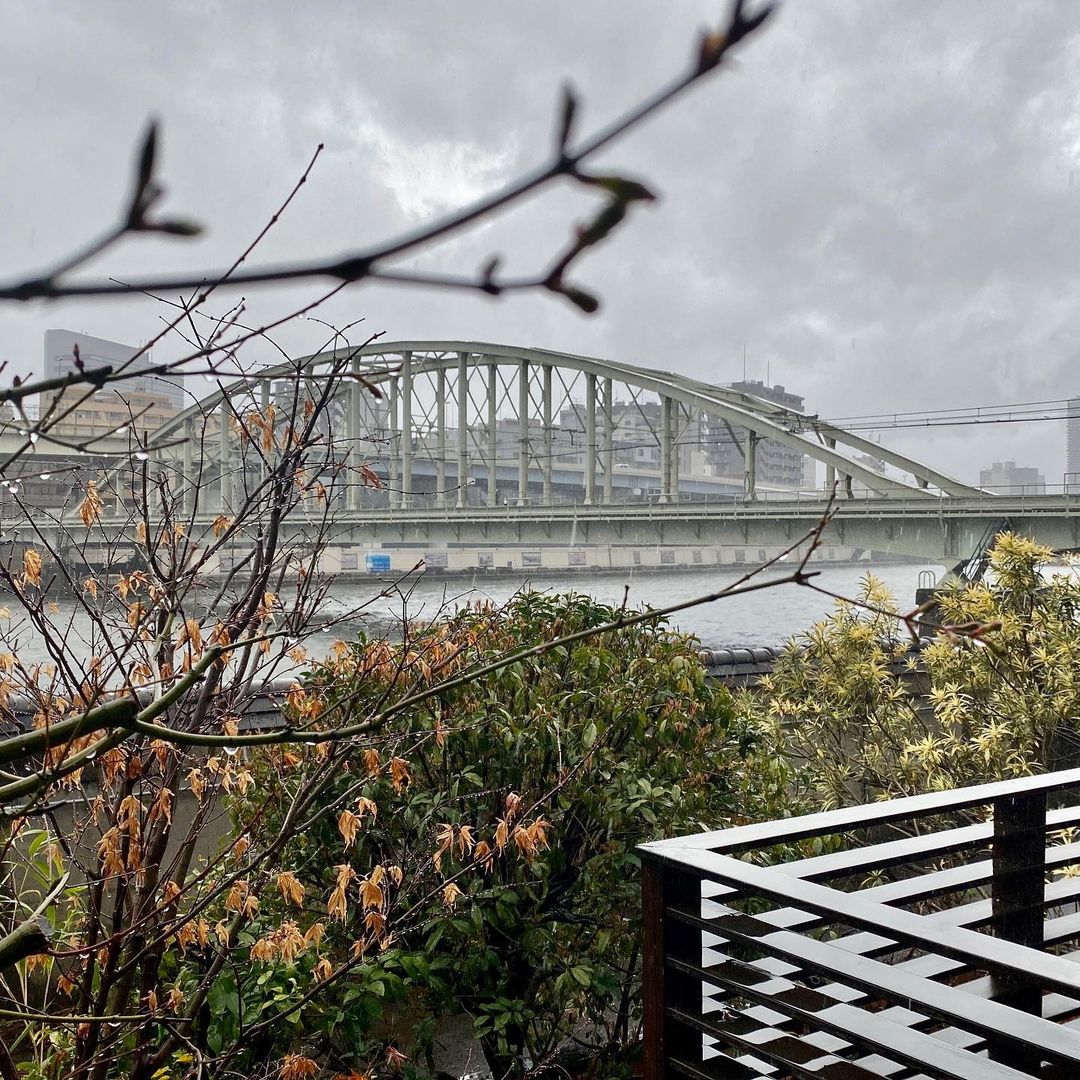 2階はカフェ。少し入り組んだ通路から階段を登ると、いくつかのテーブル、座卓、窓に向かった机、テラス席などがあり、いろんな使い方ができそうです。やはり、大きな窓が正面にあるカウンターは人気です。雨が降っていたのでテラス席は使われていませんでしたが、まあ人気でしょうね。隅田川の眺めも最高です。