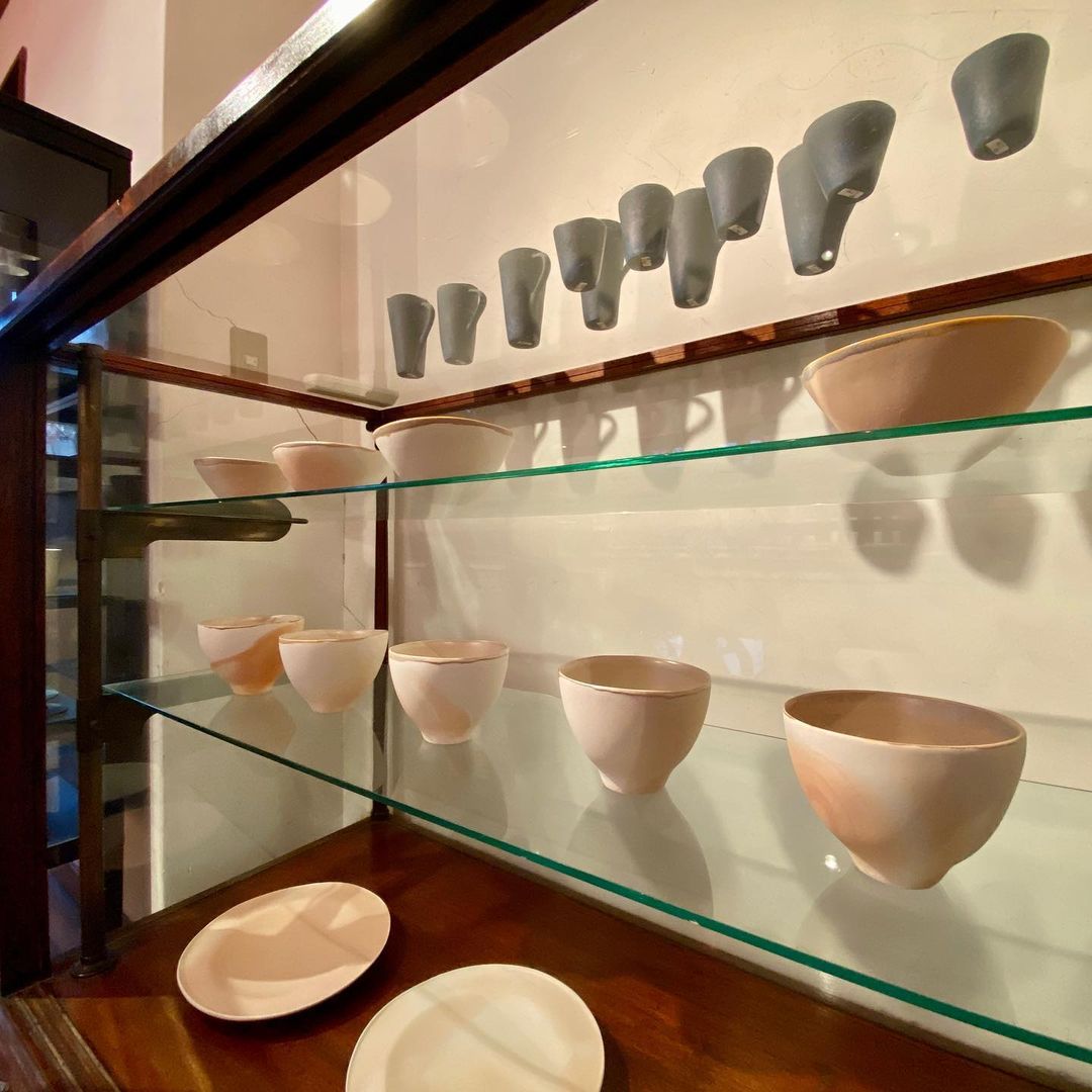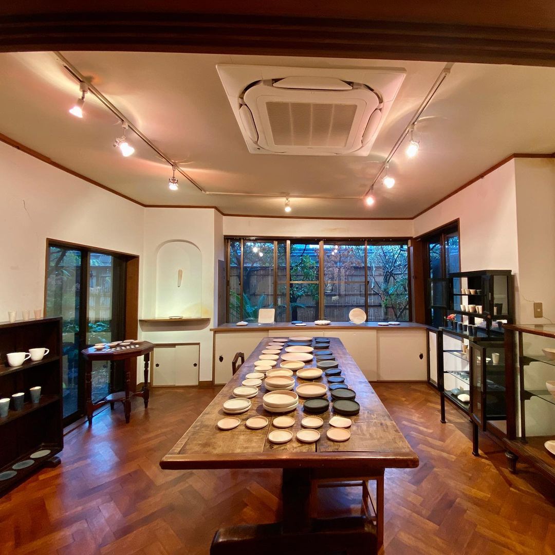 1階はギャラリー。2週間前後の陶器をメインとした展示が入れ替わり開催されています。今回は、「川村晃弘展 春招きの器」で食器を見るために行きました。このお店が面白いのは、こうした展示で販売されている食器を、2階のカフェで実際に使ってみることができるところです。