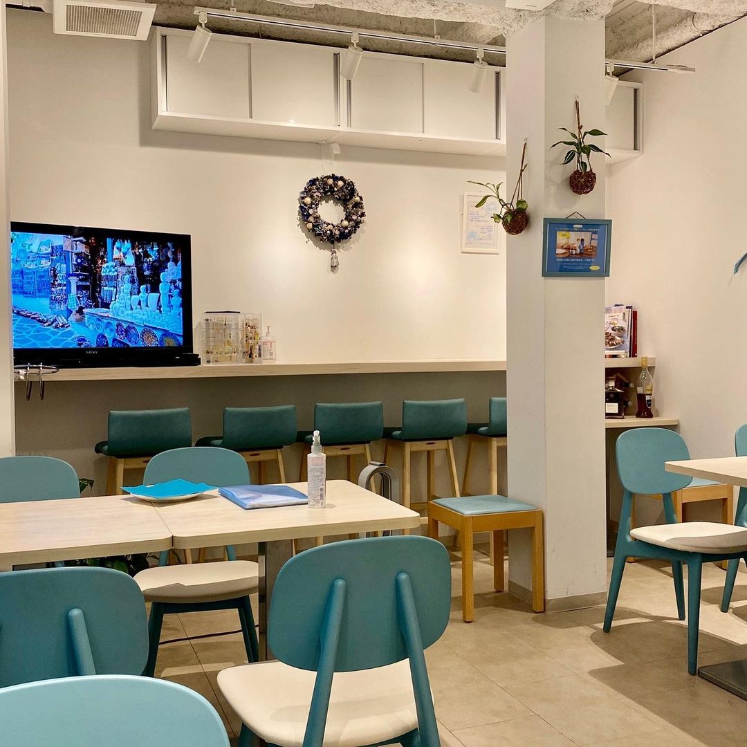 青いファサードに読めないグリークのロゴ、そして真っ白な店内が見えるガラス張りの入口。とても小さく見えますが、外観よりも奥行きがあります。多分手前側はちょい飲みスペースなのかな?奥に行くと、これまた青い椅子で統一されたキレイでかわいらしい店内。ギリシャの国旗や白い建物と海がイメージできますよね。こんなお店が浅草橋を歩いていて唐突に現れたのが印象深かったです。
