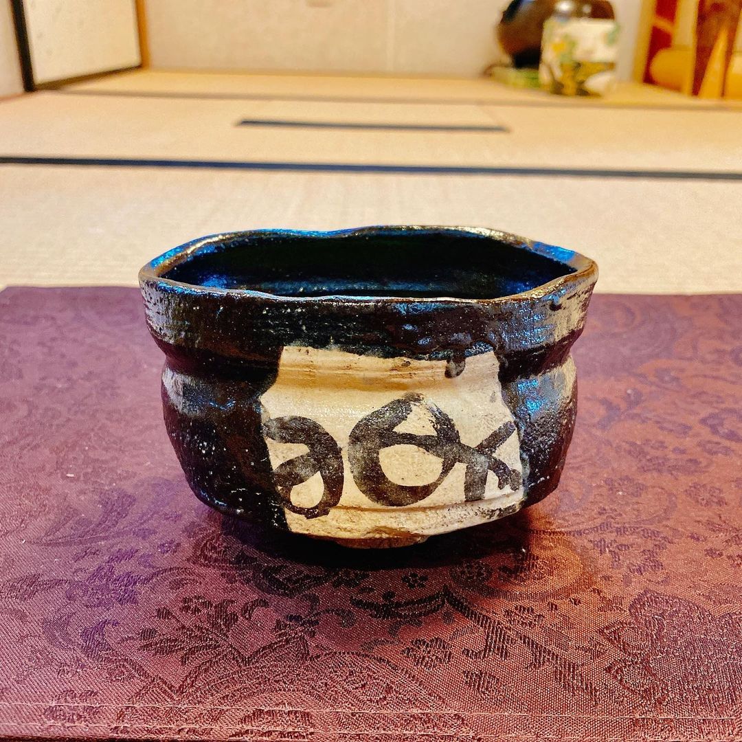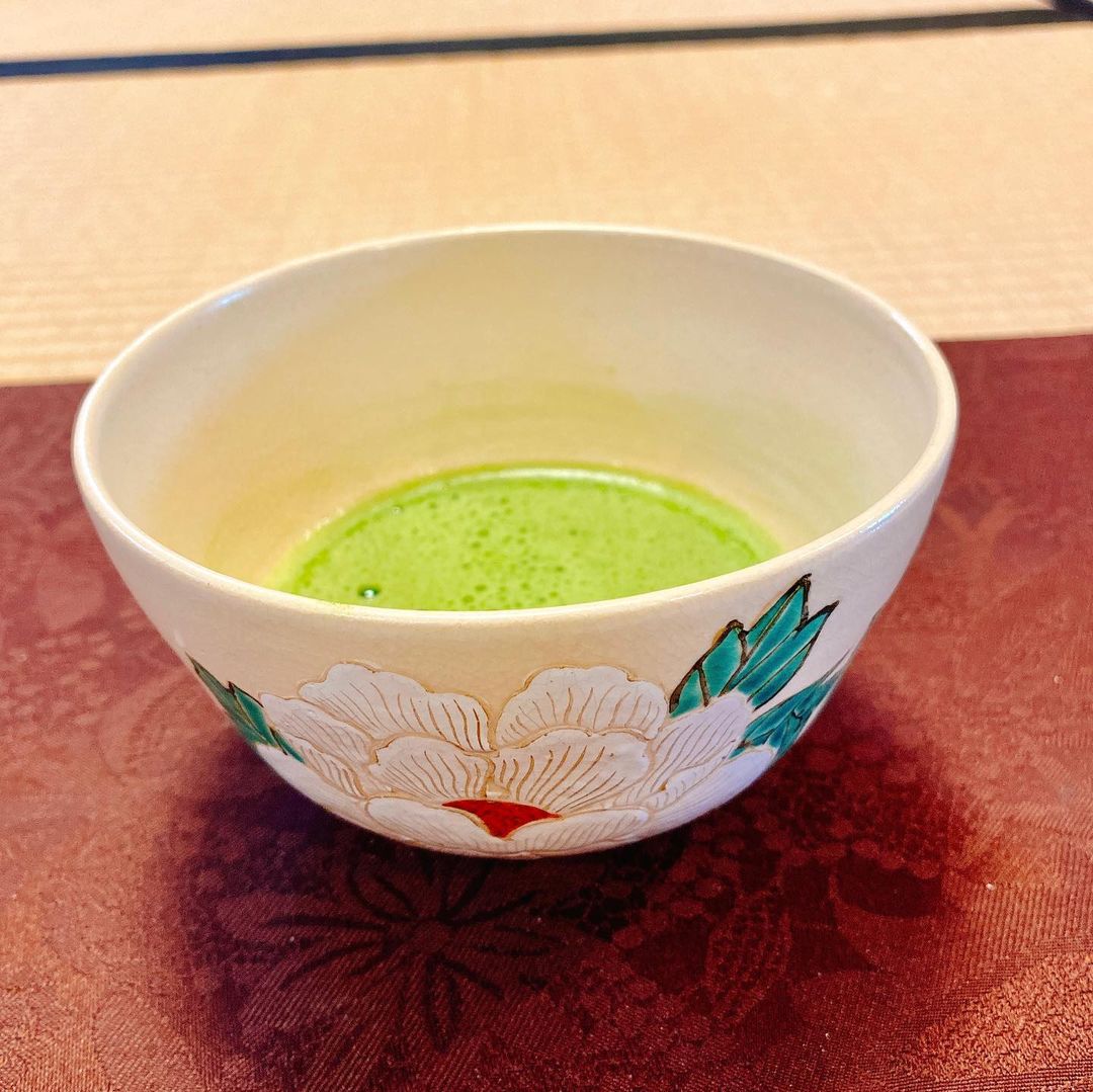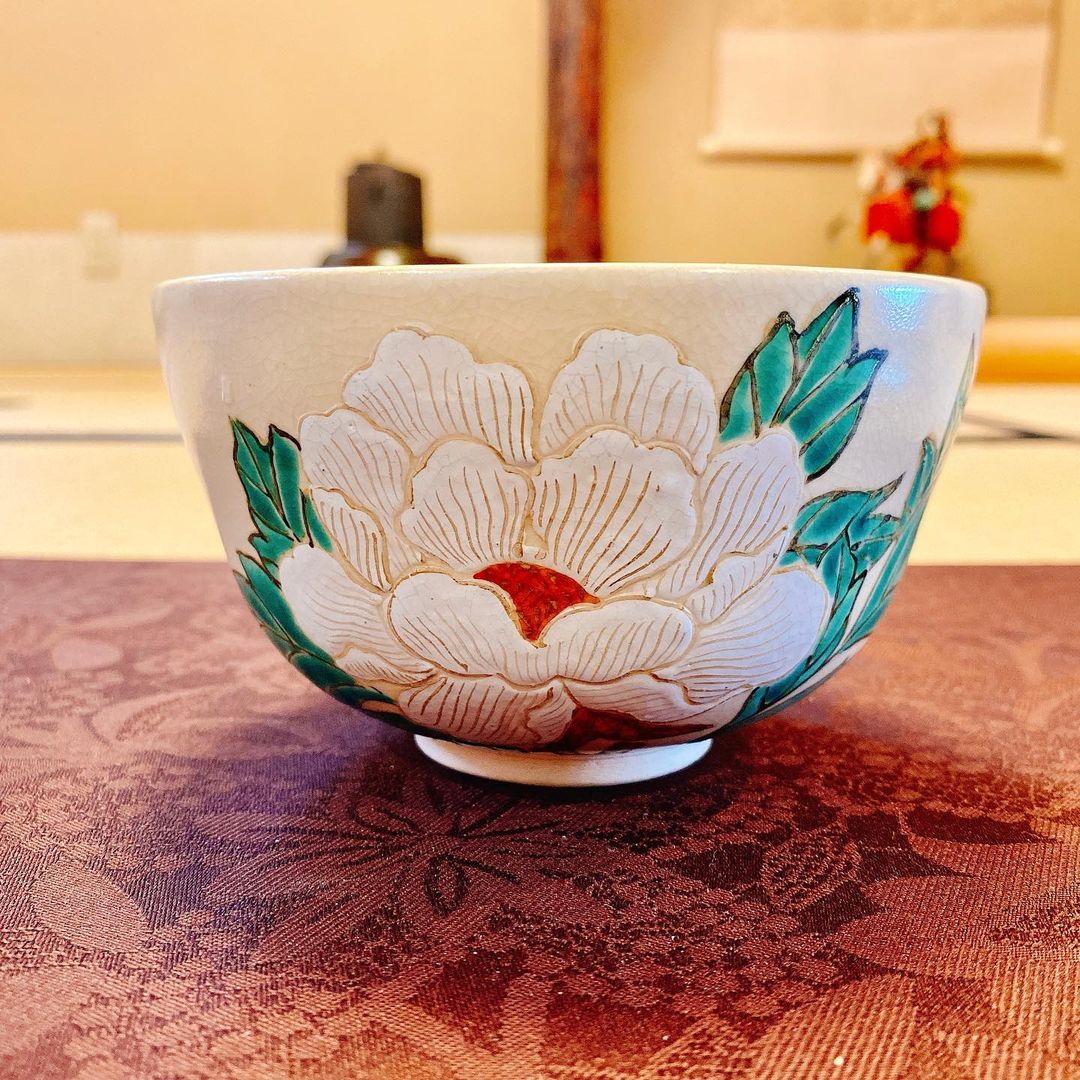もう1つ、宮川香雲という作家の白牡丹、という茶碗も使わせていただきました。こちらは先程の黒織部と比べると随分華やかな茶碗。凹凸のある絵付けです。
