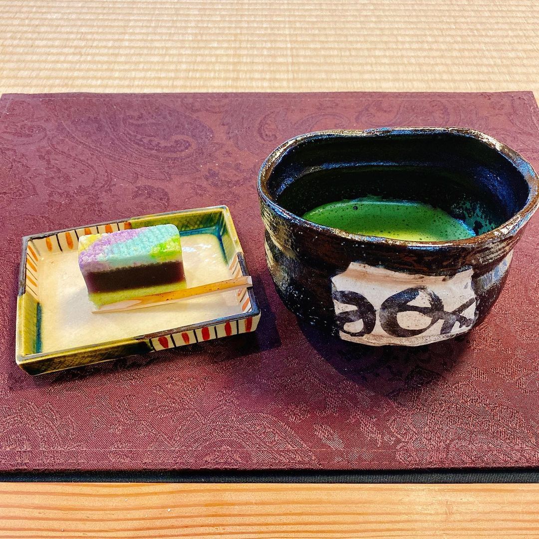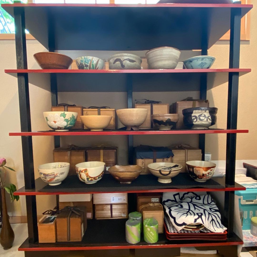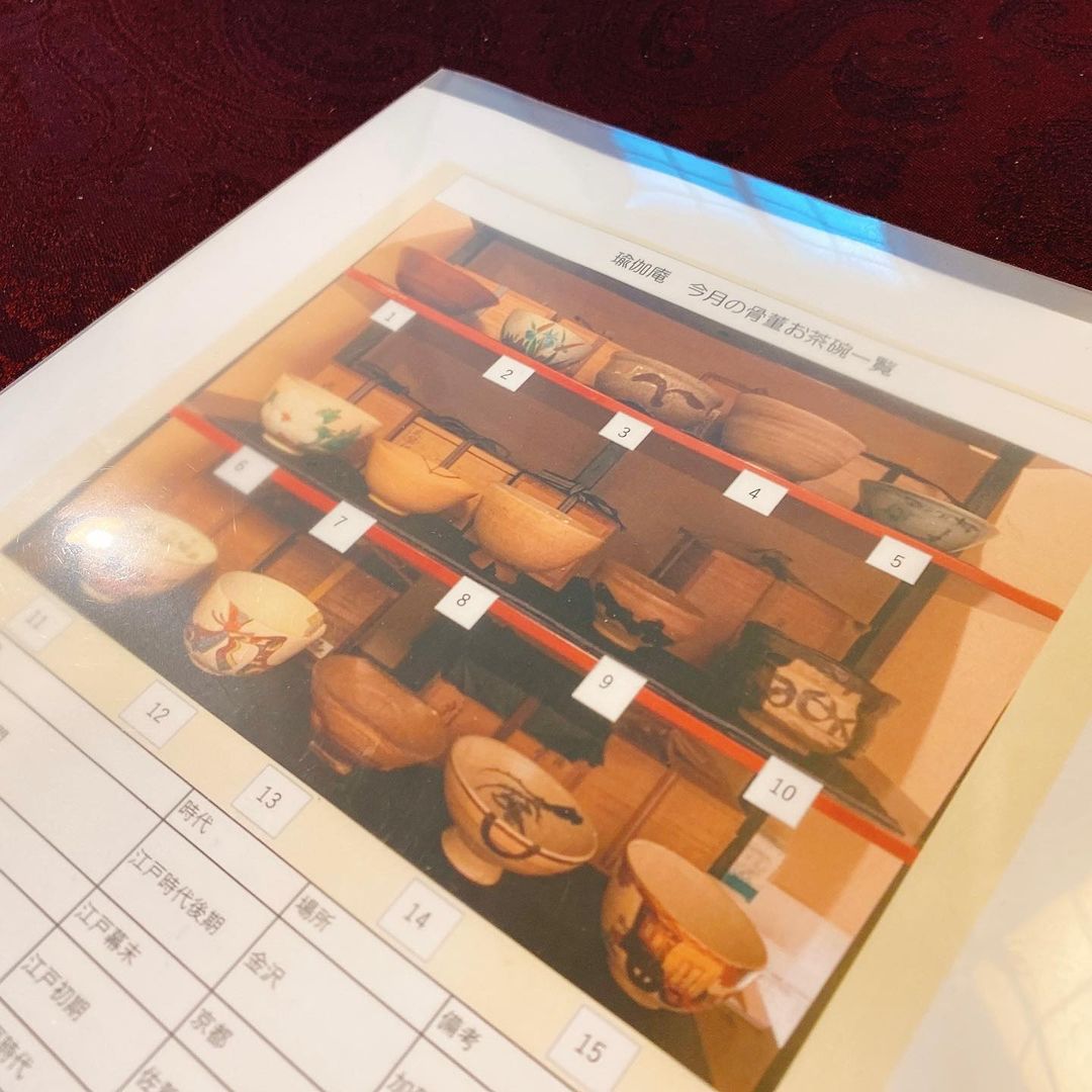 このお店では、このように様々な時代の骨董品レベルのものから現代の作品まで、様々な茶碗でお茶が飲めます。随時15種類程度の茶碗の中から選ぶことができるそうです。1つ1つ、丁寧に説明もしてくれます。種類は季節に合わせて入れ替わるそうです。歴史には詳しくないのでほとんどわかりませんが、このなかから黒織部を選んだのは、漫画「へうげもの」の影響です。