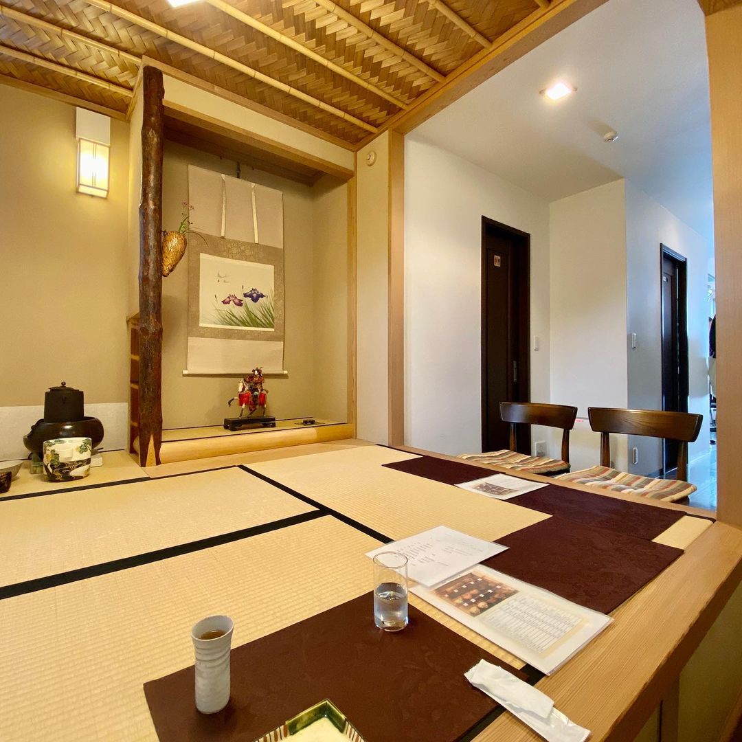 壁にかかっているのは菖蒲の日本画。このお店で抹茶を注文したときは立礼式といって、椅子に座って靴を履いたままでいただくスタイルです。そのなかでも、このように、畳敷きの舞台のようなところからお茶を出すスタイルは、宝塚歌劇団などを作った小林一三という人が考案した即庵というものだそうです。外国人の方でも、気軽にお茶が楽しめるスタイルだということですね。