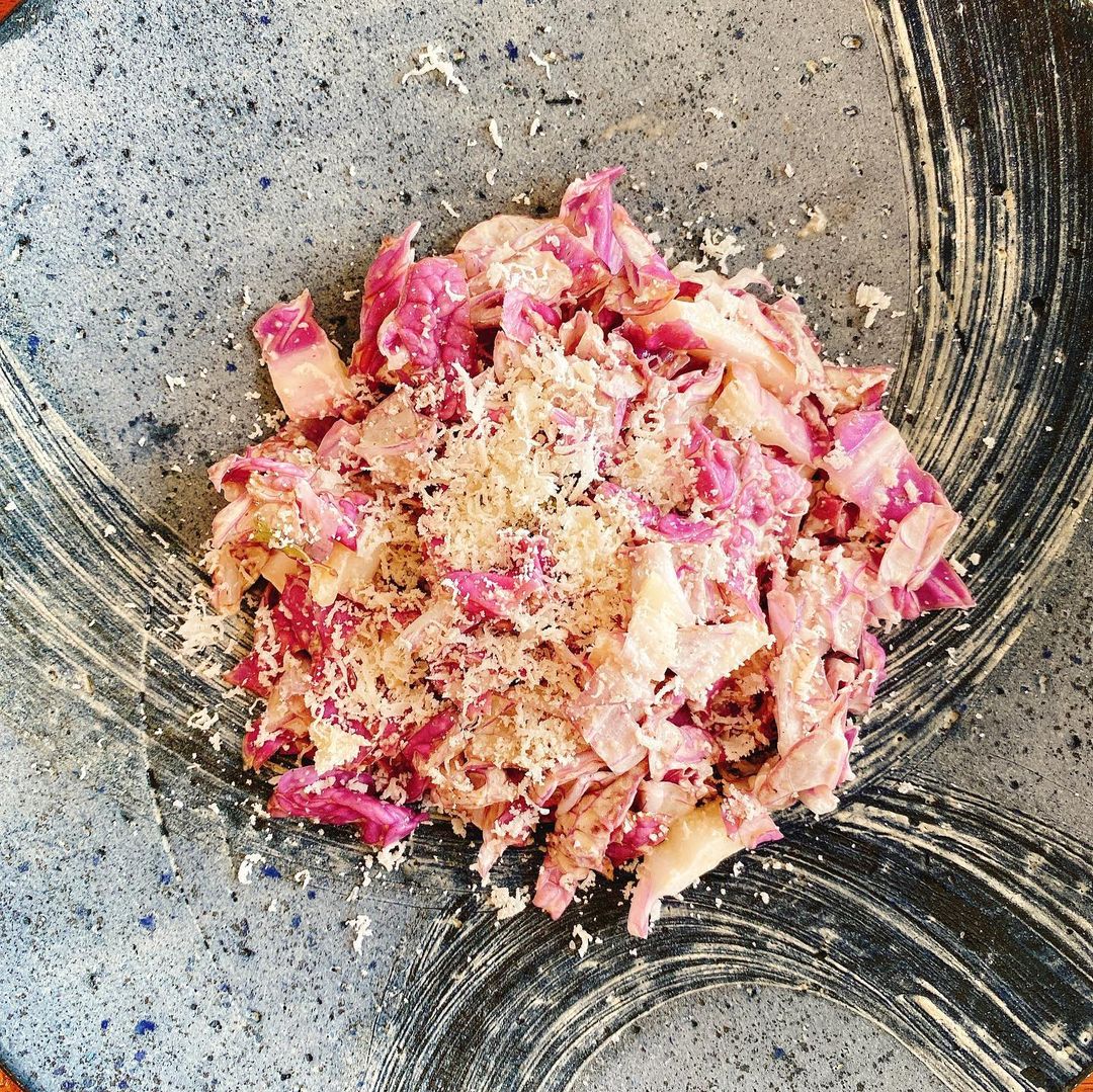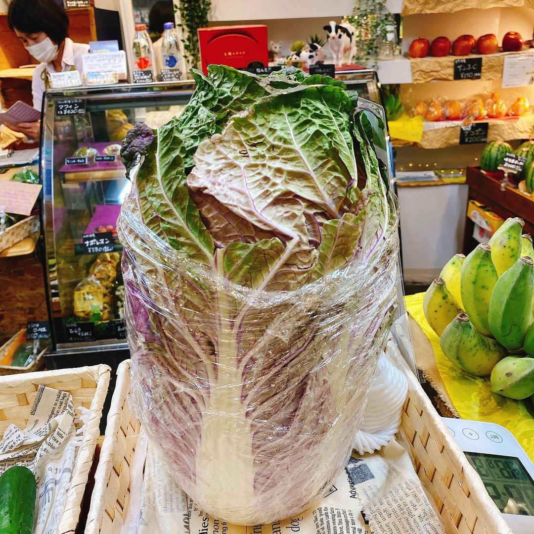 他に紫白菜というものを勧めていただいたので1/4玉購入しました。これは火を入れるより生か、蒸すくらいの方がオススメとのことだったのでサラダにしました。マヨネーズと味噌、醤油、チーズなどで食べてみました。確かに生でも渋みは少なく、キャベツのような感じです。煮込むと煮汁が紫に染まるそうです。