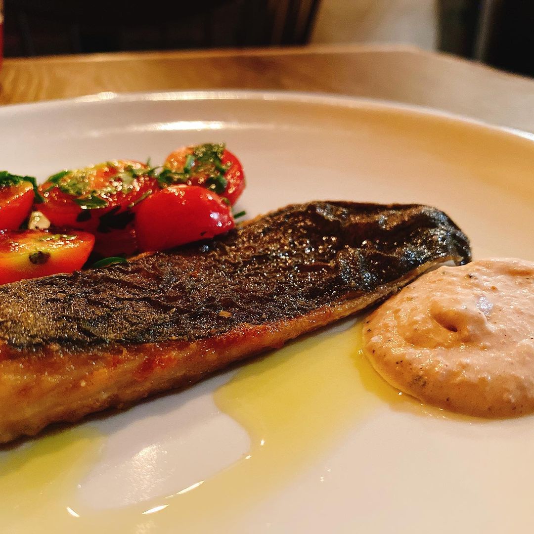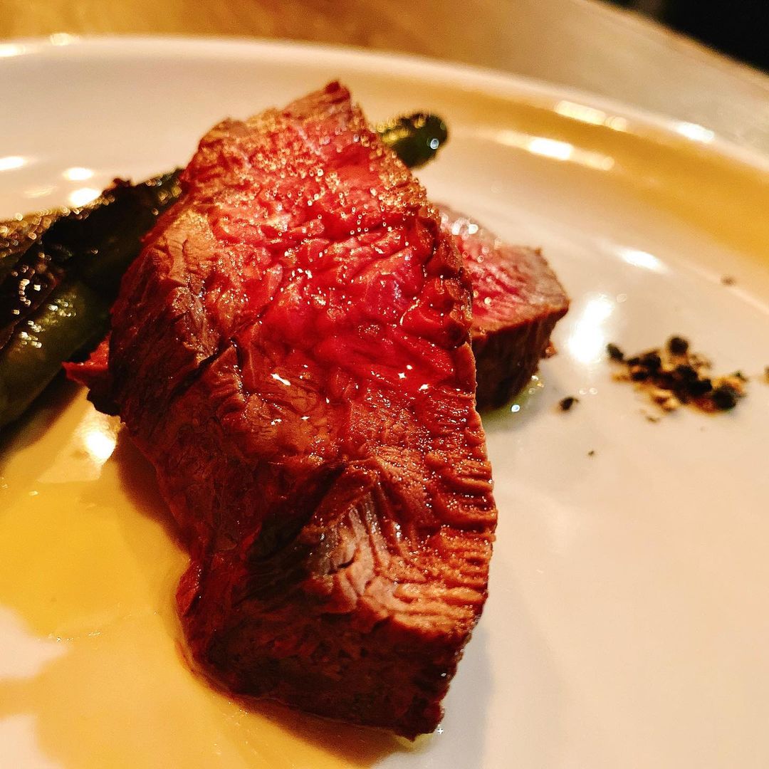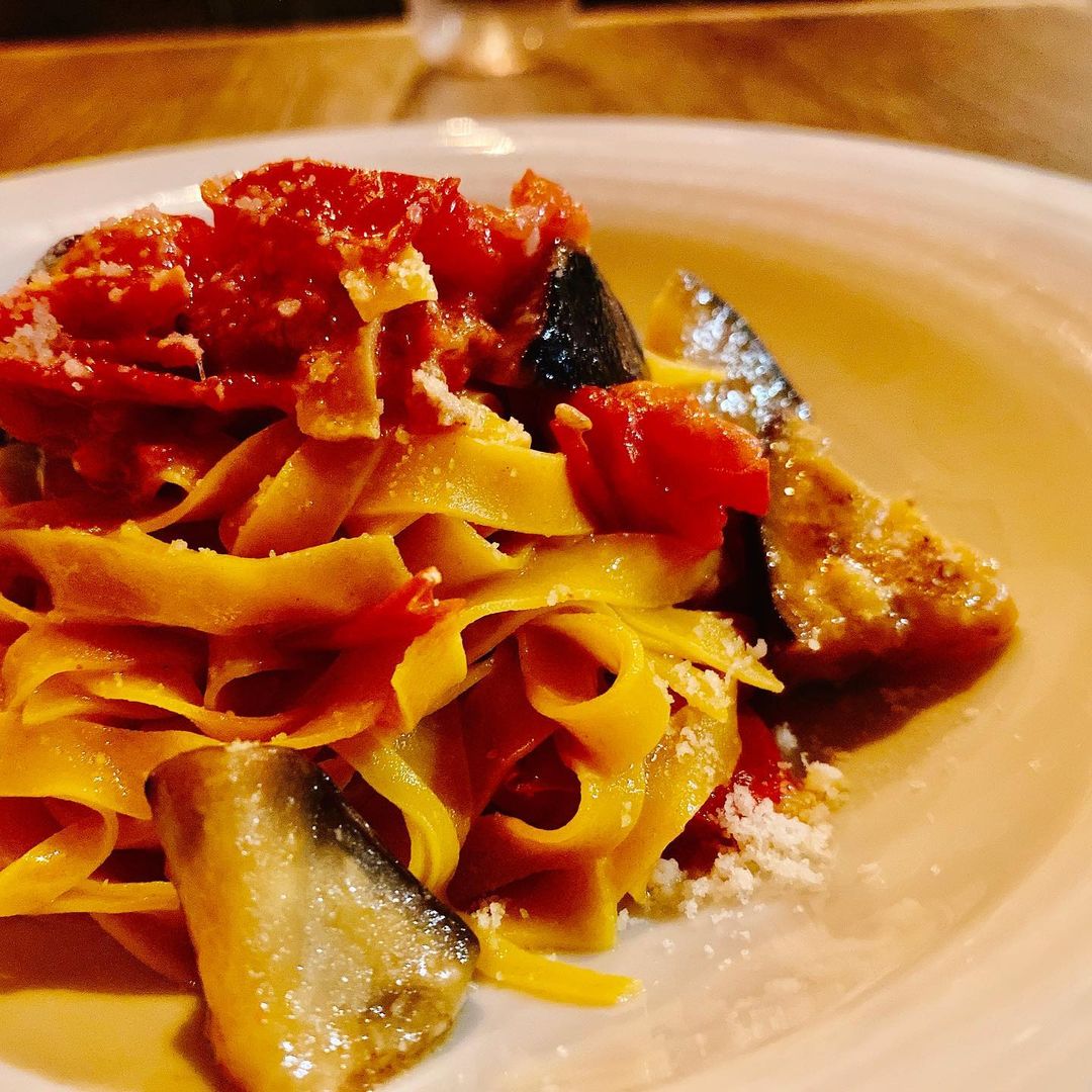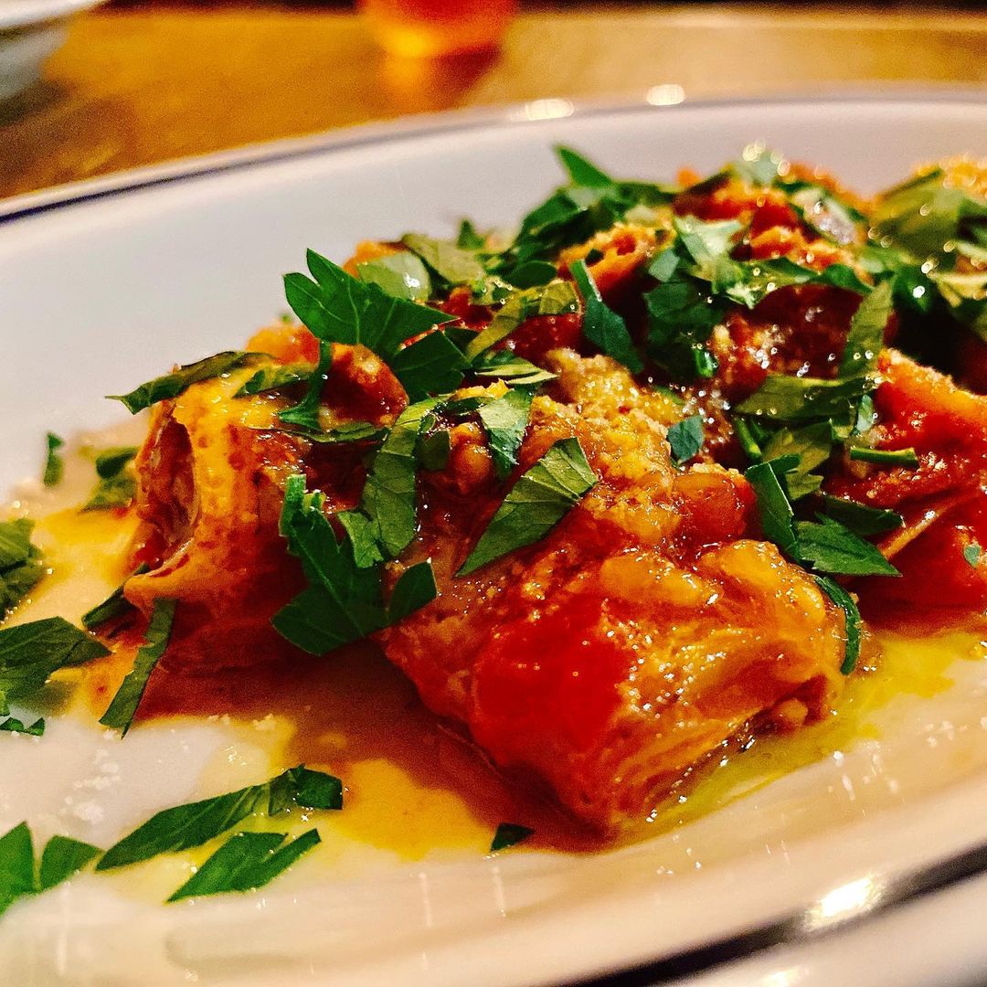 今コースは3種の前菜、パスタ、肉料理とデザートで6050円。前菜もしっかり量があるぶんお得に感じます。他の前菜はエイのグリル、豚モツのトマト煮。パスタはトマトとナス、チーズのタリアテッレ、肉は短角牛のロースト。トマト煮はンドゥイヤという辛いペースト状のサラミを使っていて、この料理がンドゥイヤという食材にハマるきっかけになりました。自分でもよく購入します。