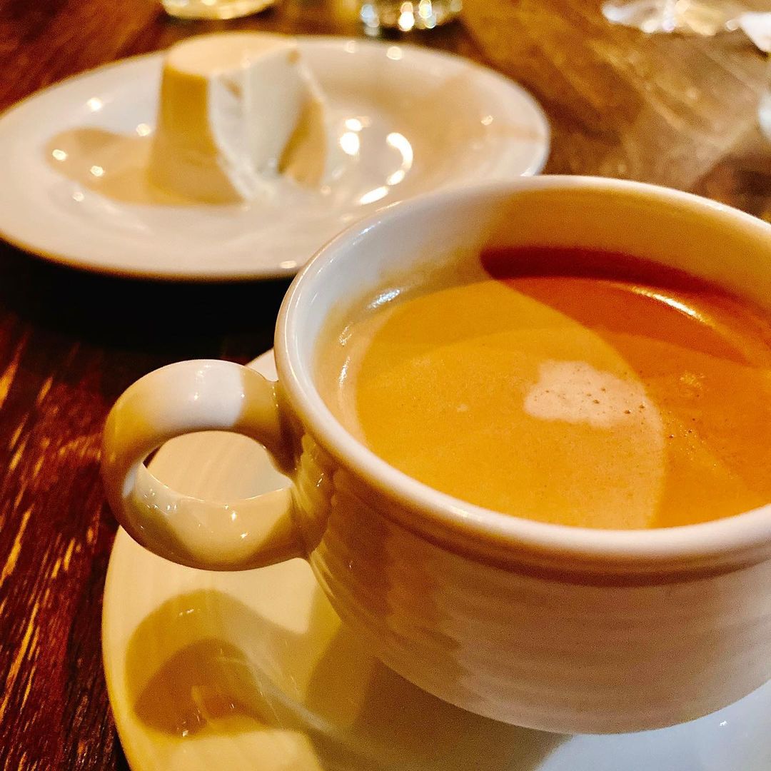 デザートはコーヒー風味のパンナコッタ、これにコーヒーも注文しました。コーヒーは普段からありますが、今はザクロやピンクグレープフルーツジュース、ワインバーのBeaux Espritsでも出していたアランミリアなどが置いてあります。