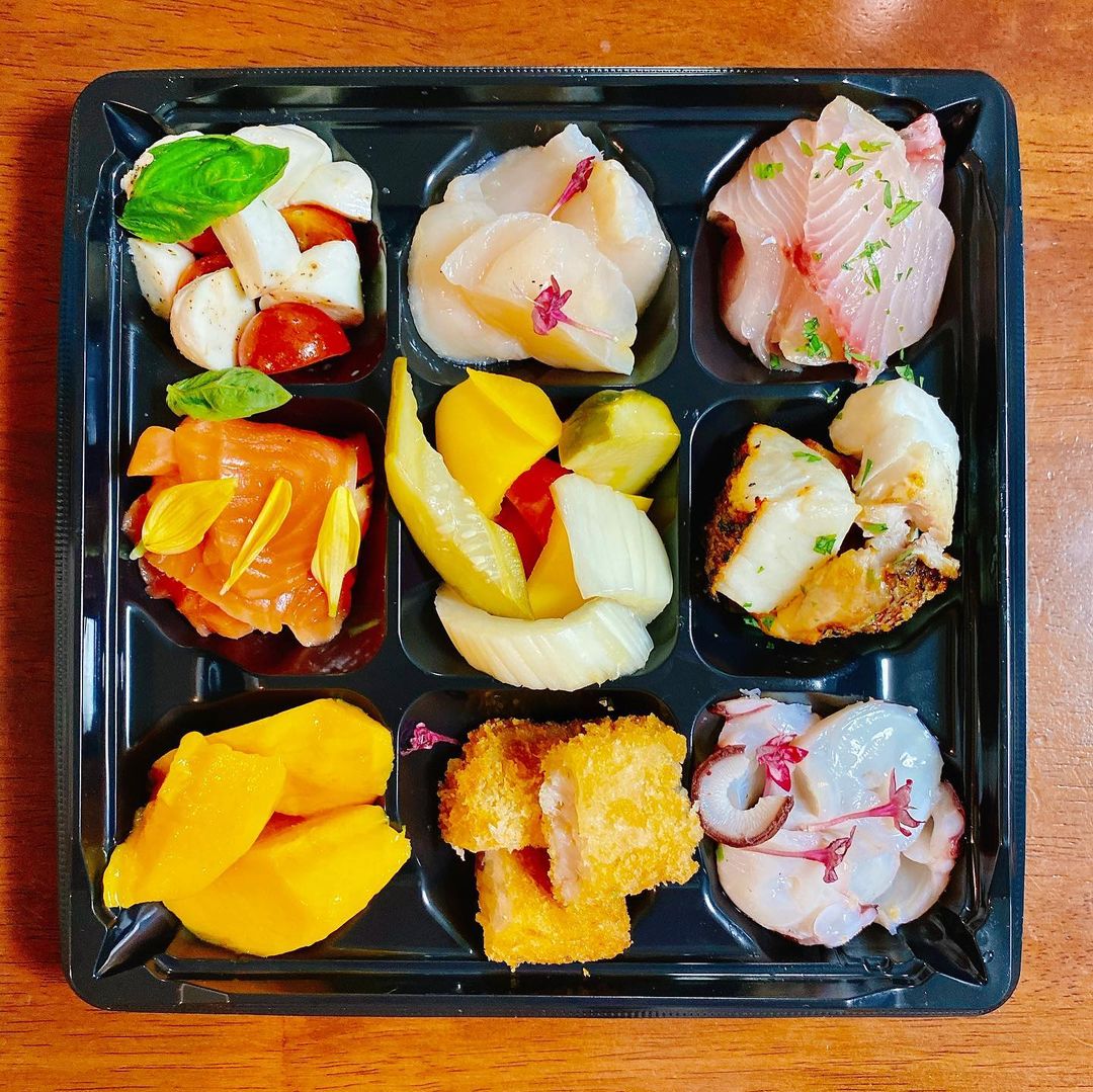 海鮮食材を中心とした9品のセットです。カプレーゼ、ホタテ、ハマチ、タコのカルパッチョ、スモークサーモン、タイのグリル、白身魚のフライ、ピクルス、マンゴーなどです。酒飲みにぴったりの濃いめの味付け、特に気に入ったのはタイとサーモンです。しかし、海鮮丼みたいなラインナップですね。