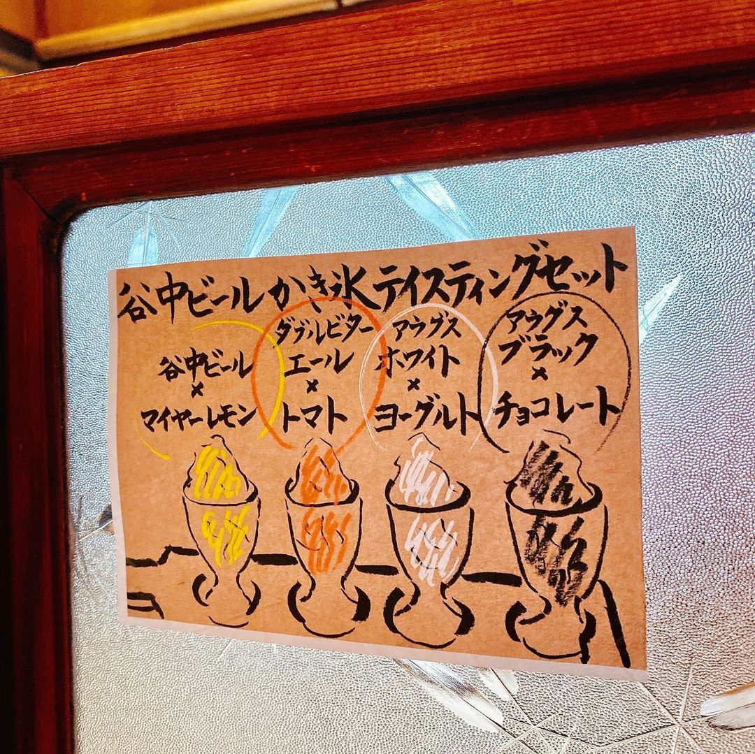 ビアシロップを使った大人向けのかき氷ですが、通常のこのお店のテイスティングセットと同じようなグラスで提供されるのが面白いですね。谷中ビールとマイヤーレモン、ダブルビターエールとトマト、アウグスホワイトとヨーグルト、アウグスブラックとチョコレート、とかき氷のフレーバーとしてビアシロップを使っています。