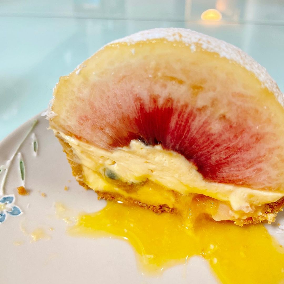 半分くらいの桃を丸ごとタルトの上に乗せ、その中にはディプロマットクリーム(カスタードと生クリームのブレンド)、パッションフルーツなどが入っています。桃自体もかなりの甘さで、遠慮なくスイーツです。見た目のインパクトもいいですね。