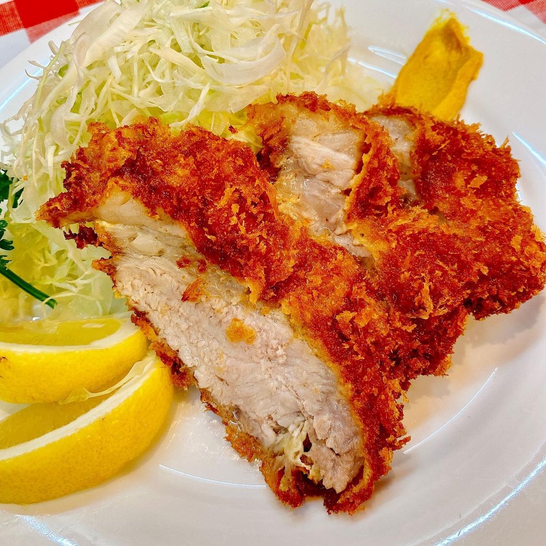 320gもの量のとんかつなので、一部皿に分けて盛っていただきました。最初は全部盛ってもらうつもりだったんですが、確かにせっかくのとんかつ、とんかつ単品としても食べた方がお得感ありますね。キャベツとソースと一緒にいただくのも当然良いものです。