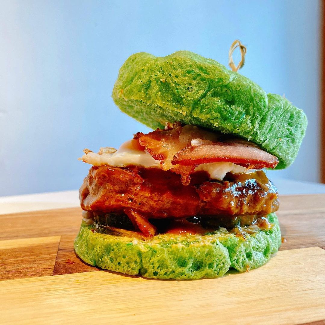 バンズは3種類、他に緑のモリンガ、赤のパプリカがあります。竹炭は見た目ほど味に主張はないですが、モリンガは野菜の優しい甘味が出ています。
