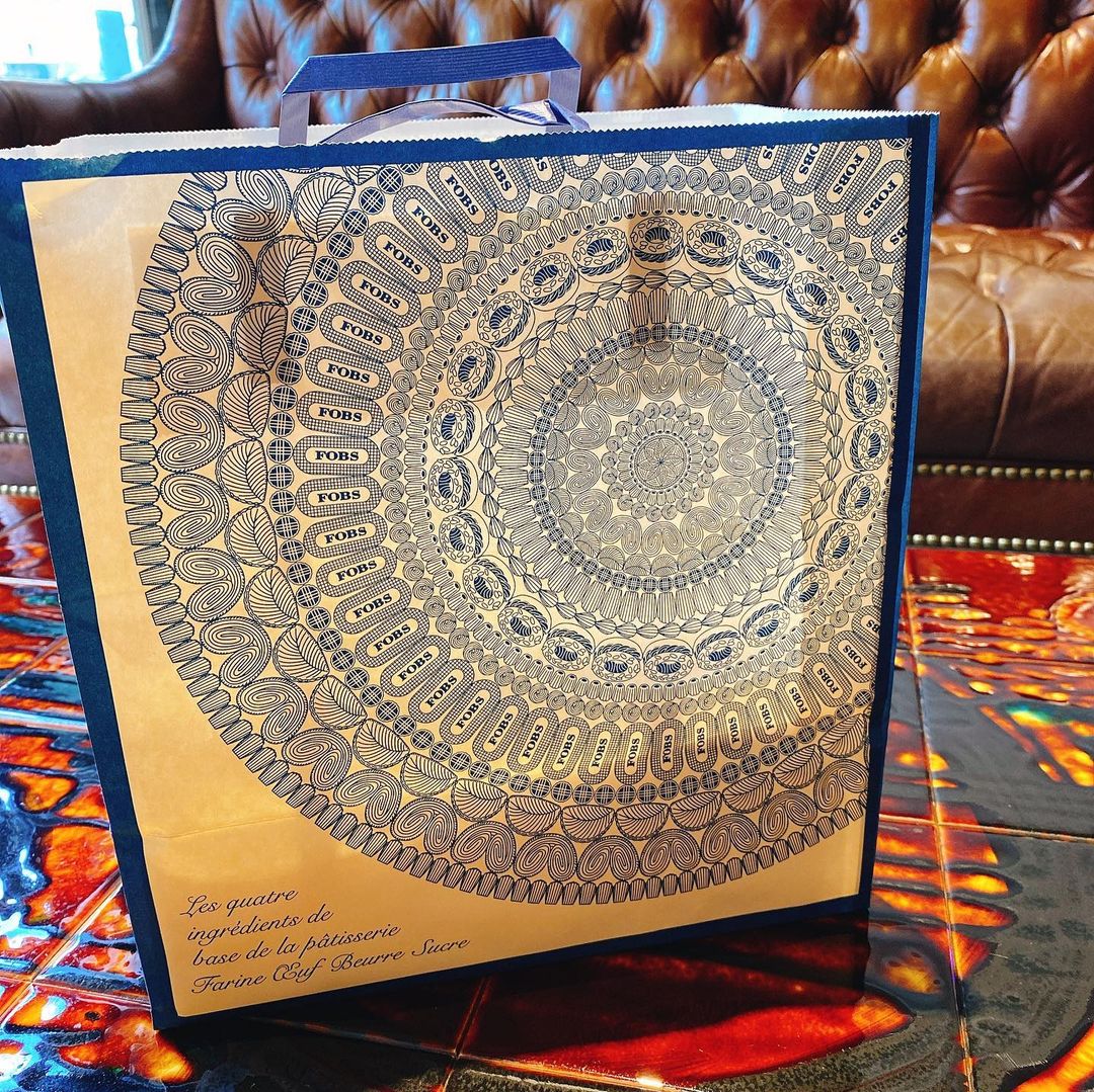 このお店は持ち帰りの紙袋もかわいいです。レースに見えるけど、よく見るとこのお店のお菓子があしらわれているんですよね。マドレーヌやパイはわかるけど、ドーナツも商品にあるのかな?