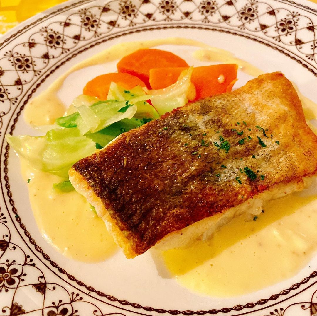 クリームソースとともに散らしてある塩加減が好みの味。セットには他にサラダとサーモンのケークサレ、パン、デザート2種、コーヒーで1700円。メインは1つで2種から、他に真鱈のソテーも選べました。