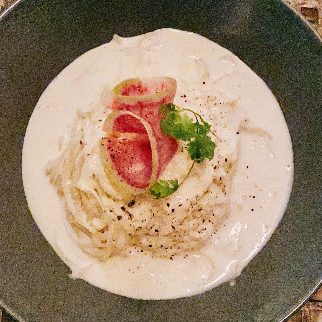 浅草のタイ料理&イタリアン、Ourbsのとうもろこしの冷製濃厚パスタ。カペリーニくらいの細さの麺と冷たいコーンスープのようなソース。具は少なめなので、濃厚だけどツルッとあっさり食べられるひと皿です。このお店のInstagramの投稿を見て食べるタイミングを見計らっていました。ディナーのみ、数量限定のため予約した方が確実です。