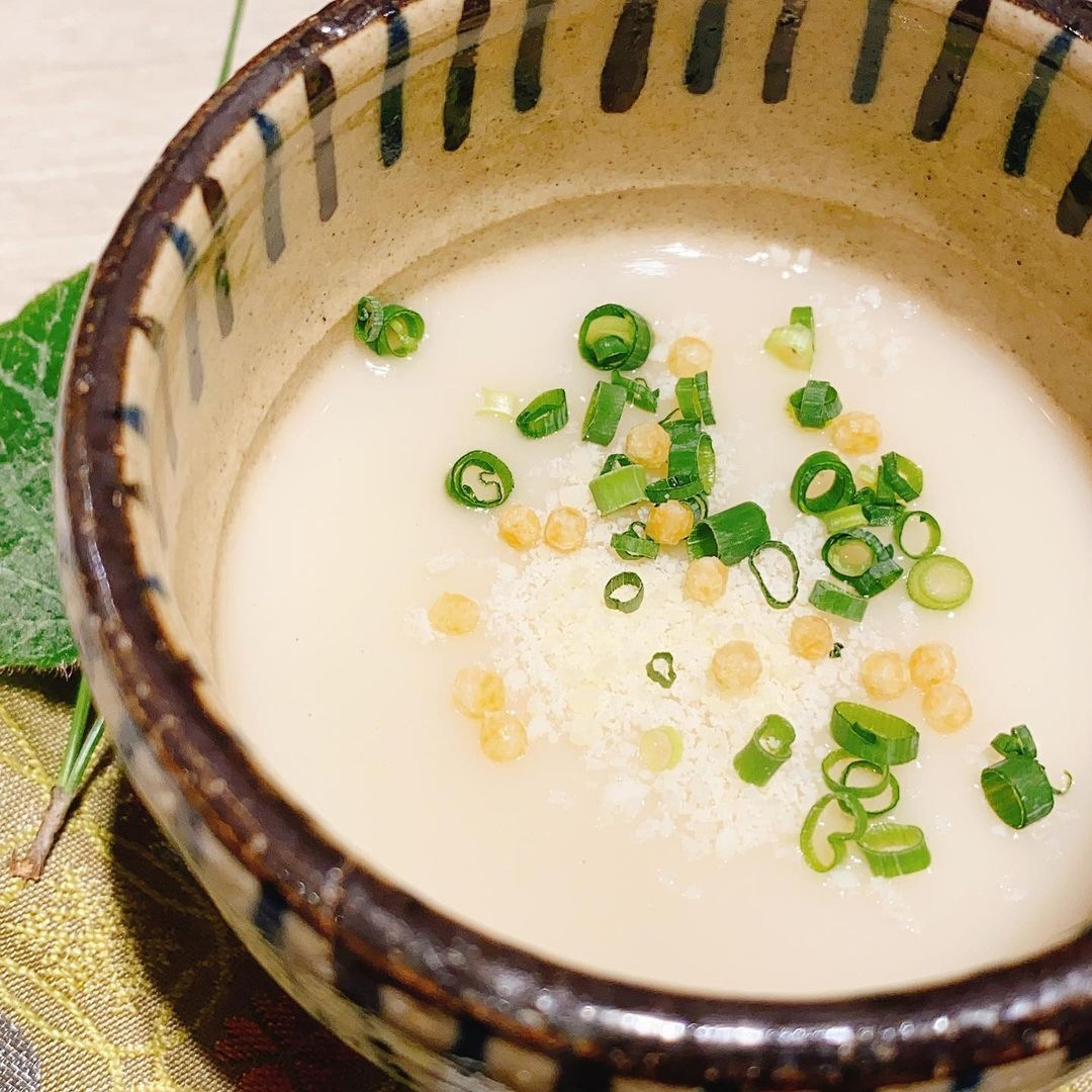 ランチプレートが配膳される前に割烹、日本橋ゆかりのモッツァレラチーズ茶碗蒸しと洋食店、レストラン桂のコーンポタージュをいただきます。茶碗蒸しはとろっとしたチーズ風味しっかりのあんがかかり、新しい味わい。