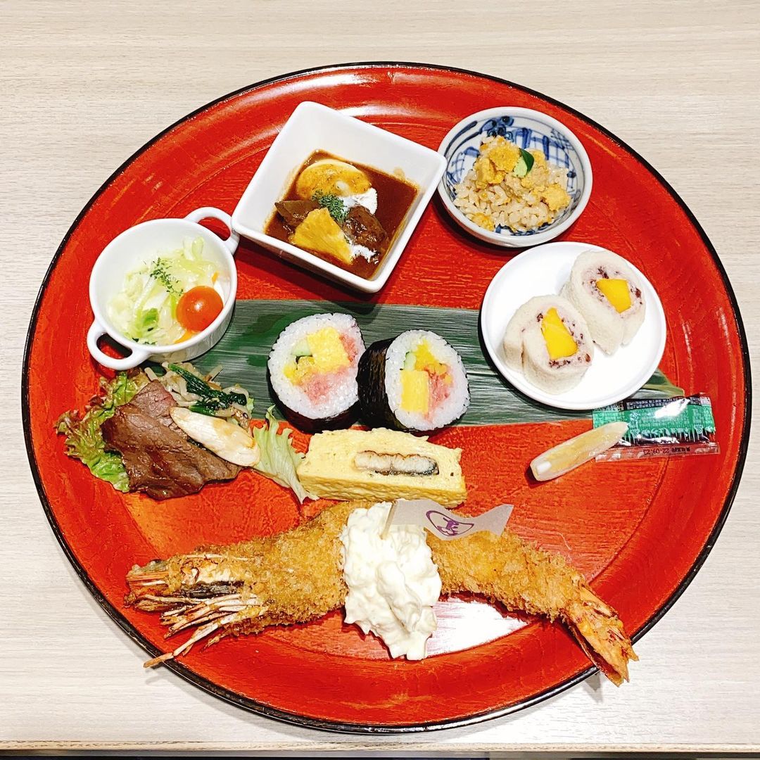 手前の旗の刺さったたいめいけんの海老フライをはじめとして、うにご飯、うまき、牛頰肉のワイン煮、鮪の太巻き、牝和牛の牛モモ焼きと、どれから手をつけようか迷ってしまうようなラインナップ。お子様ランチってこの、どれから食べよう?みたいな迷う楽しみがあったんだったなあと思い出しました。