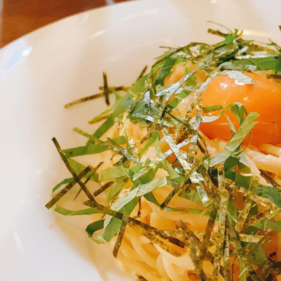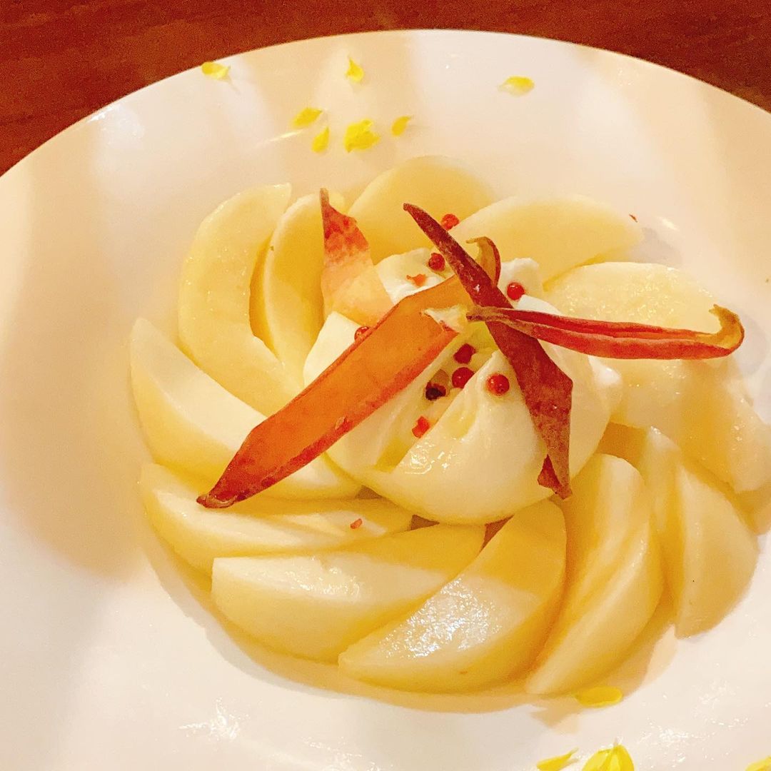 桃とブラータチーズ、桃の皮はドライフルーツみたいにしてあって、飾りのようだけどちゃんと料理の一部。それと明太パスタを注文しました。