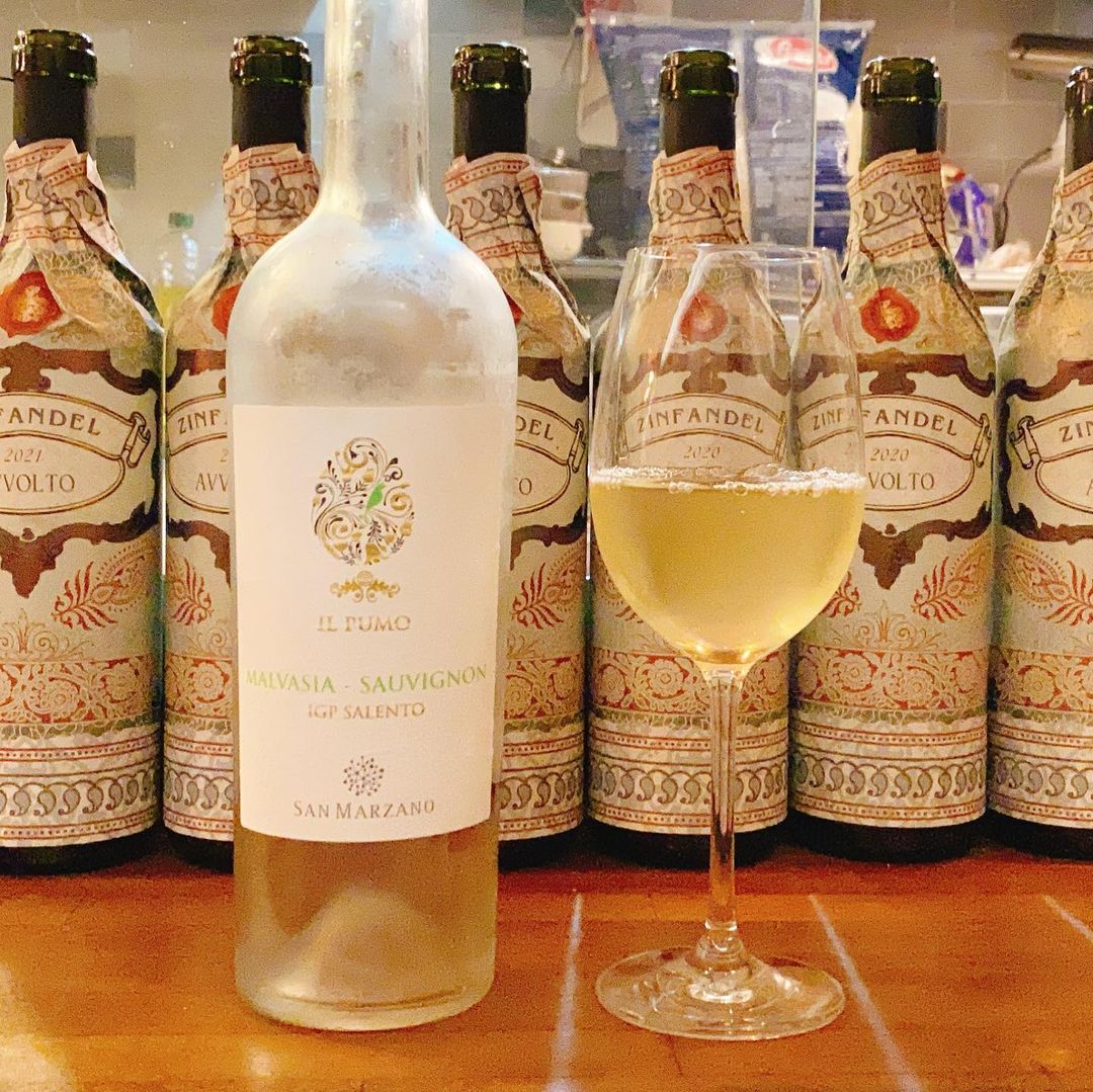 お酒は料理の背景にも写っていますが、アッヴォールト ジンファンデル 2021。これは近くのイタリアン、ボンマルシェ ボンテで購入したこともあります。ボトルが洒落てますよね!もう1つは白、サン・マルツァーノ イル・プーモ プリミティーヴォ。