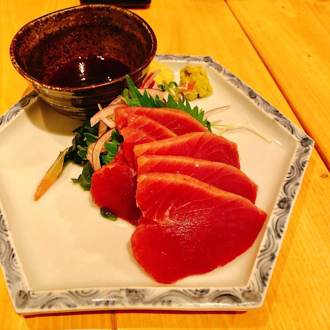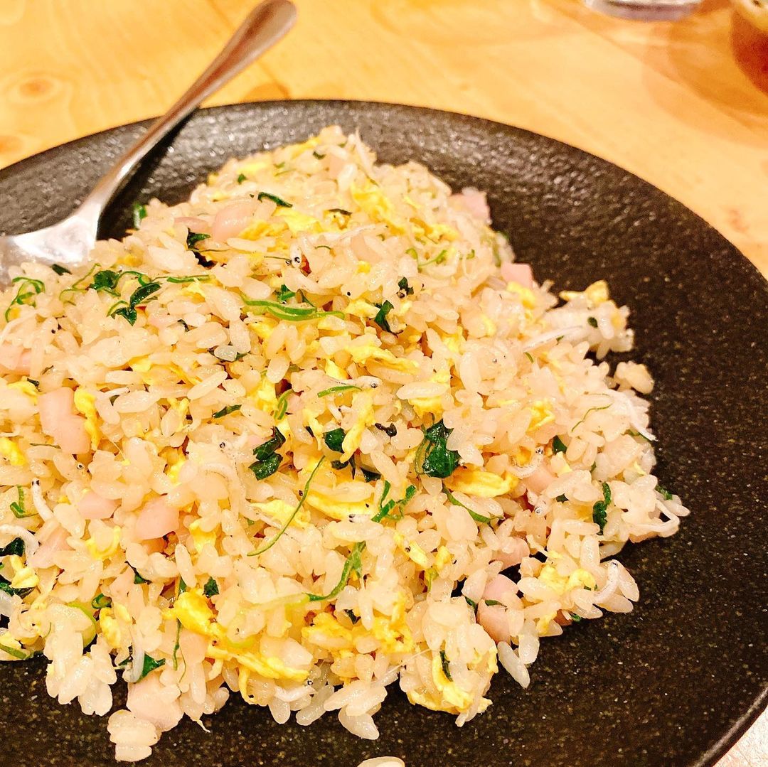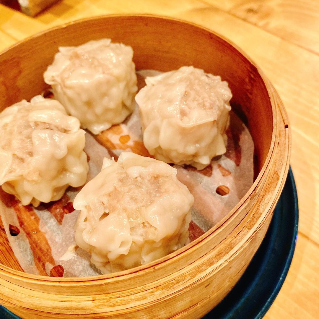 柿とほうれん草の白和え、本カツオのお刺身、豚肉焼売、大山どりのよだれ鶏、叉焼入りポテトサラダ、大葉チャーハン。この中だと焼売とカツオが特にお気に入り。