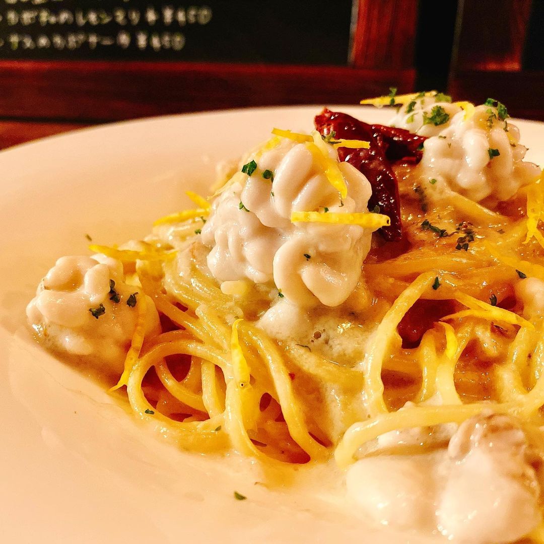 その他、トマトのごまみつ和え、おまかせパスタ 白子のペペロンチーノ、モッツァレラと玉子の煮込みのようなもの(メニュー名失念)を食べました。白子のペペロンチーノはちょっと珍しい組み合わせ。柚子も香り、喉を通った後を爽やかにしてくれます。