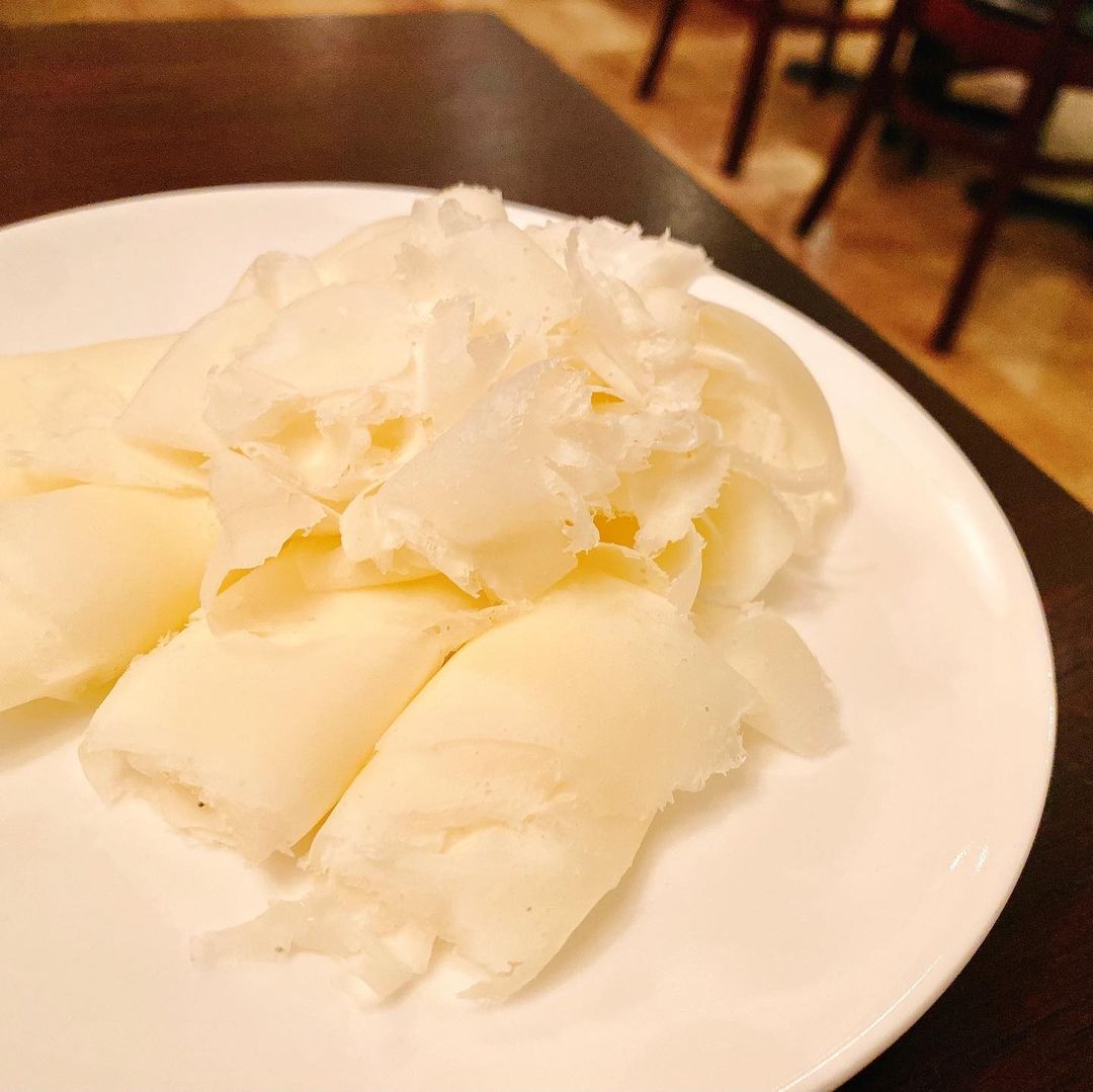 素揚げっぽいゴボウのフリットを飾った挽肉も具沢山のボロネーゼ。揚げたゴボウも香ばしく、旨みもしっかりとしています。麺は生パスタです。オプションでラスパドゥーラチーズというチーズを削ったものをつけられるため、それを乗せて味変したりもできます。このチーズはおつまみとしても良しです。
