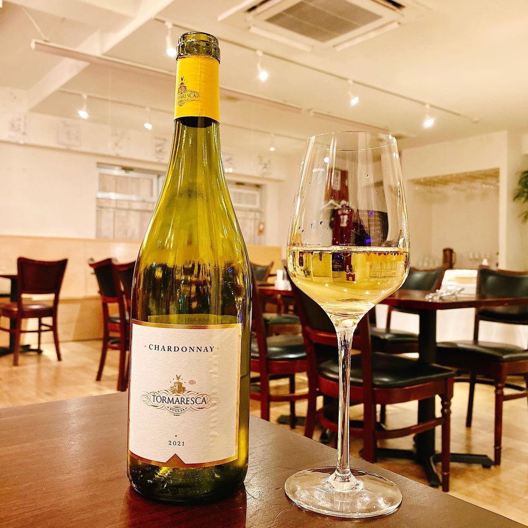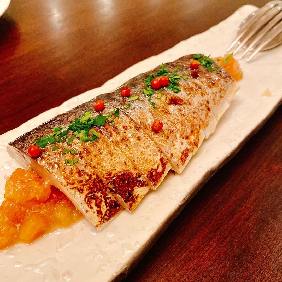 同行者はホタテ貝の濃厚クリームパスタを、そして八戸産炙り〆サバ フレッシュトマトソースを前菜としていただきました。ソースというよりマリネのような感じで、これとピンクペッパーが〆たサバの酸味とも合います。酒はワイン、トルマレスカ シャルドネをいただきました。