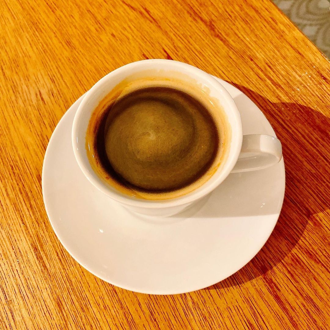 コーヒーのように見えますがアルコールメニュー、おそらくアマレットリキュールを垂らしたコーヒーだと思います。コーヒーでなくアルコール由来の軽い苦みとそれより強い甘みがあり、アーモンド香が香ります。