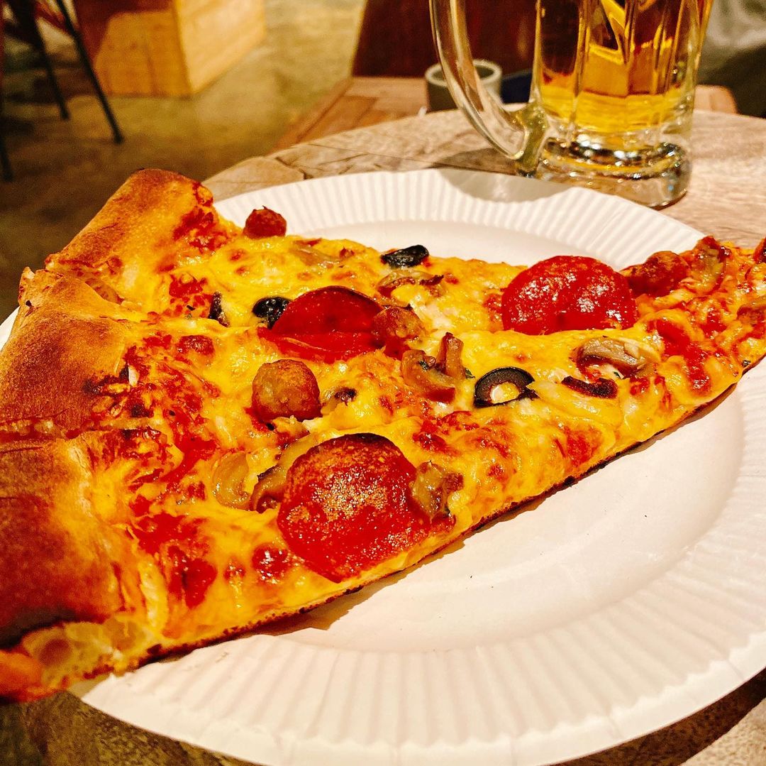 フードはこの日、日本橋などに店舗があるピザ屋のPizza Sliceとのコラボでピザを提供していました。週末限定のフードメニューだったそうですが、年始以降も提供しているのかは未確認です。これに合わせて生ビールもいただきました。